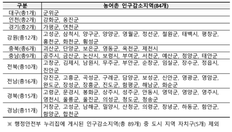 구분 | 농어촌 인구감소지역 (총 84개) |