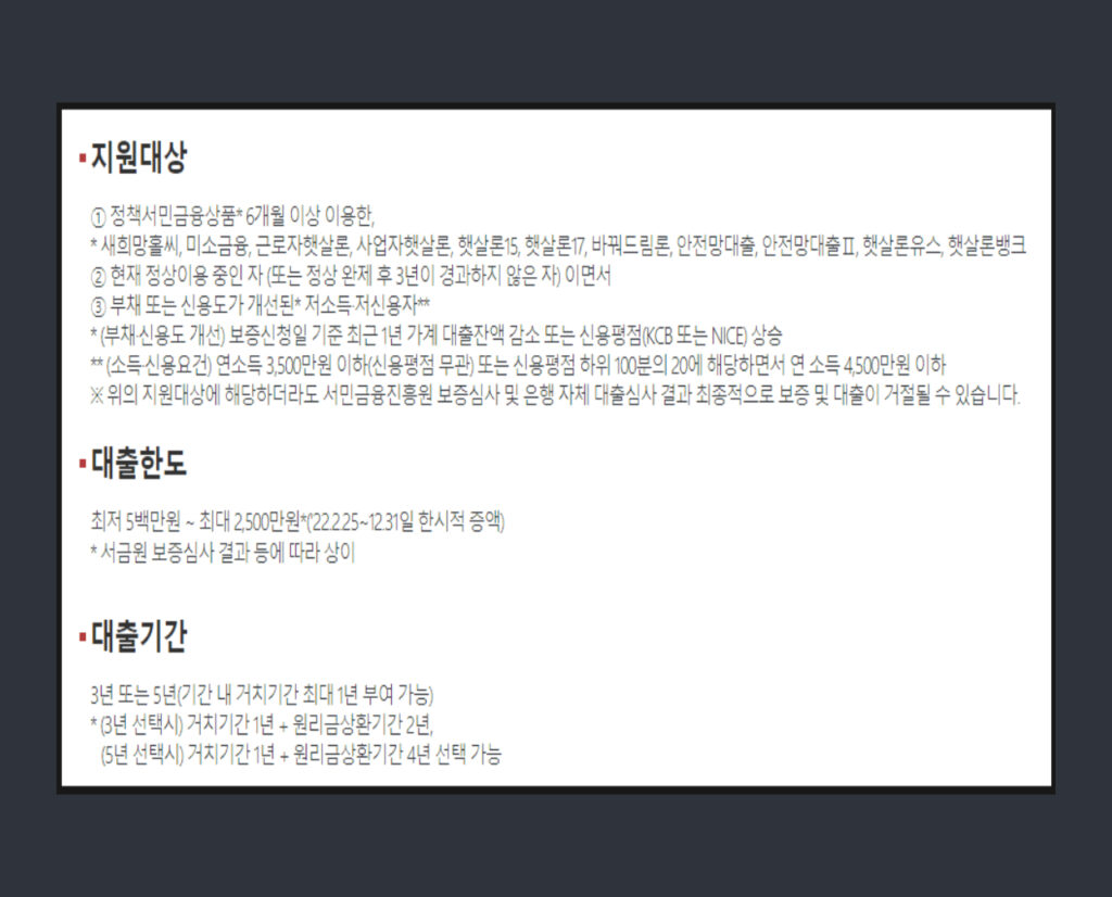 지원을 받을 수 있는 조건은 정책적인 서민금융상품을 6개월 이상 이용하며 부채 또는 신용도가 개선된 저소득층과 저신용자가 해당됩니다.