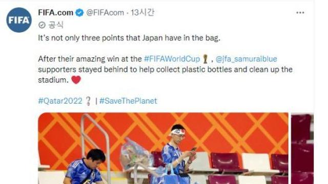언론에 보도 된 일본 팬들의 축구장 청소 모습 24일 국제축구연맹(FIFA)에 따르면 일본